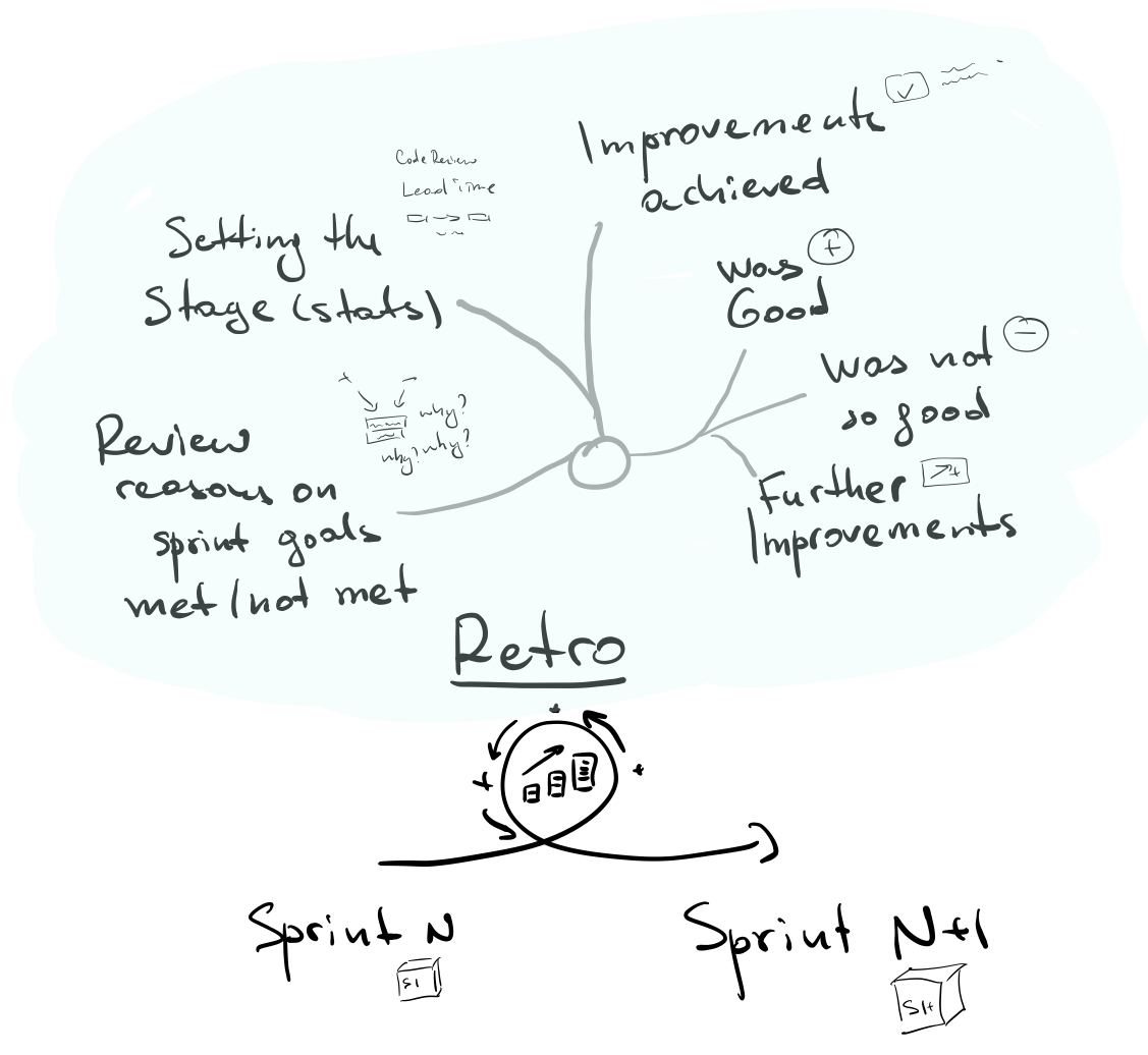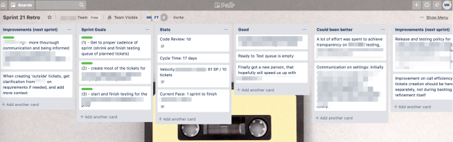 This shows the team where we at with desired improvements and is a good starting point for overall recap of things that happened during the sprint before the current one.
