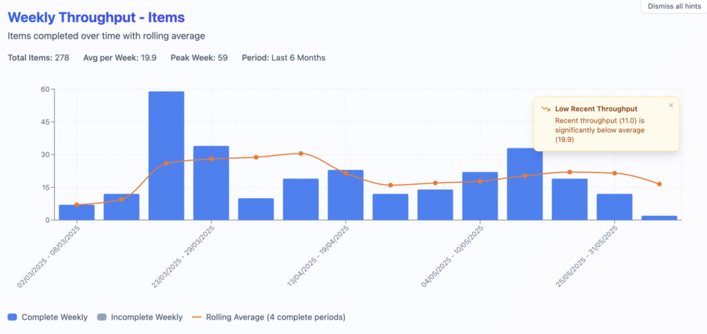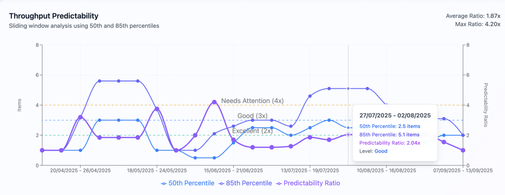 an example in visualizing percentiles. We can see that on week 27/07/2025-02/08/2025 team’s delivered 2.5-5.1 items which is in many cases enough to forecast more realistically than in simple average number