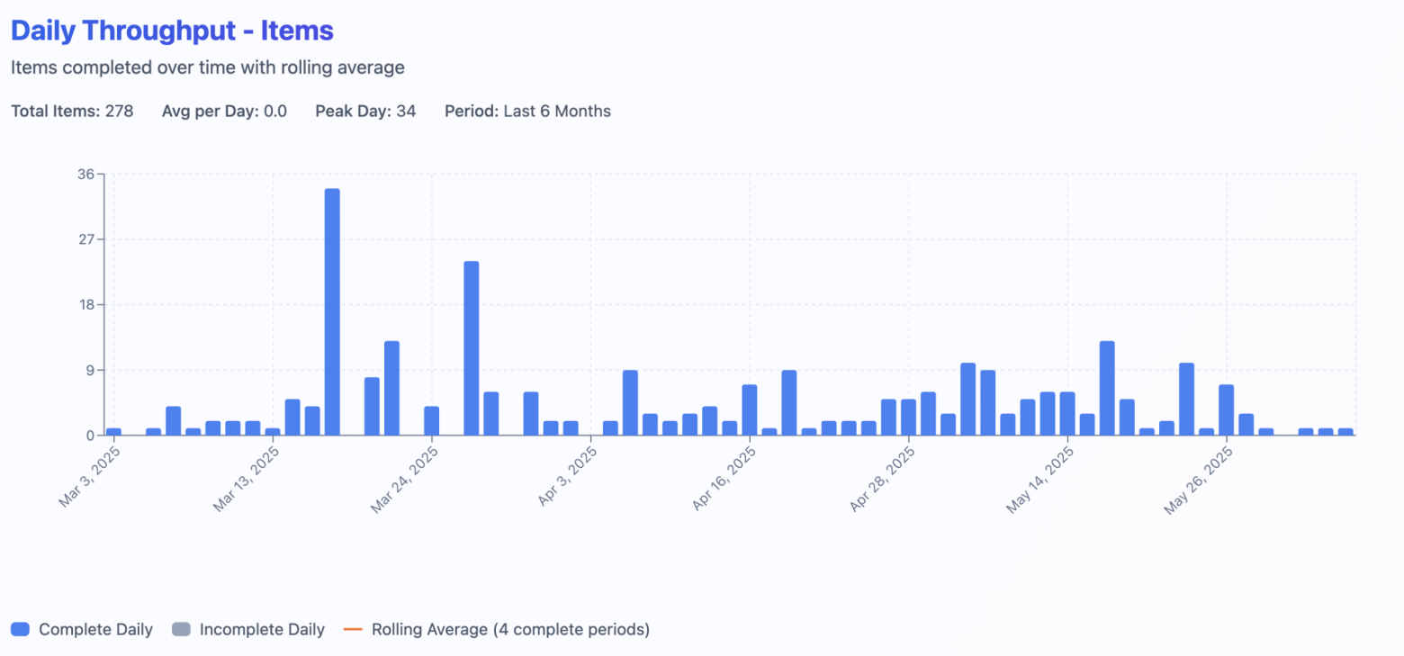 Different work types affect throughput. Completing 4–5 large user stories versus 10–15 small bug fixes yields different counts. Analyze throughput by work category to understand these effects.