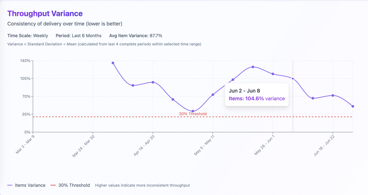 Forecasts require stable throughput. The coefficient of variation quantifies this: