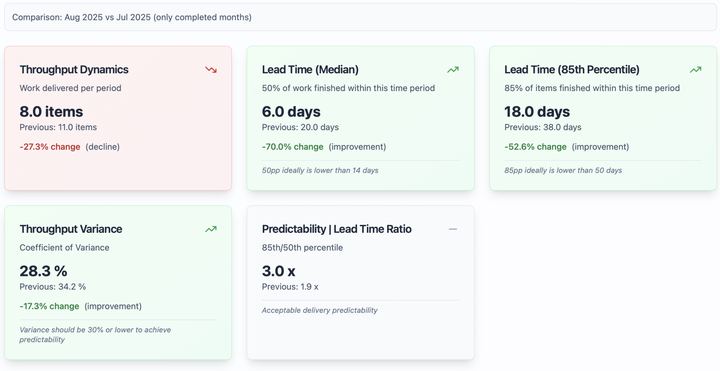 Excellent numeric stability doesn’t guarantee the right outcomes. And vice versa: stable throughput is not necessarily a pattern of a healthy team.