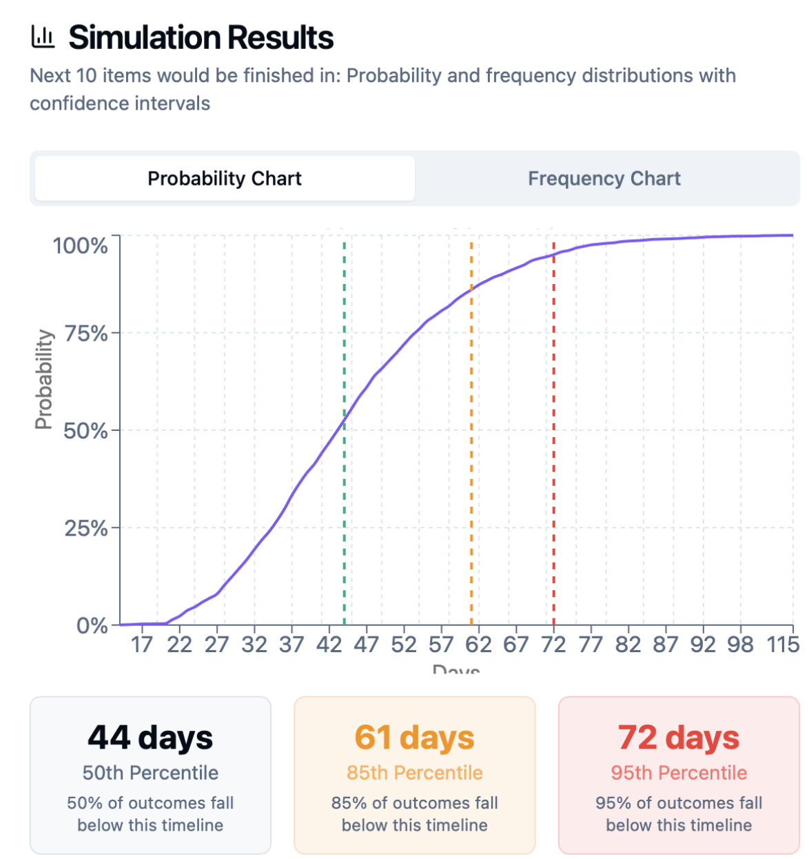 Present to stakeholders: “Forecast: it will take 39-50 days.” Using the 85th percentile offers a safer buffer, though planning at the 50th percentile is common practice.