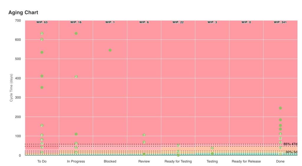 - Monitor your aging chart daily, ideally during team synchronization meetings. When items approach or exceed the 85th percentile, investigate causes: Are items too large? Are dependencies blocking progress? Are team members overcommitted?